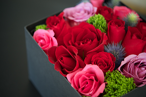 ボックスの中には季節の花、または薔薇を隙間なく詰めたアレンジメント♪